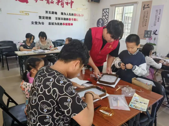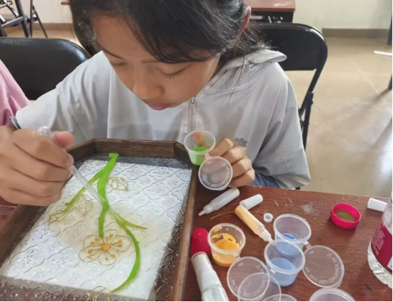 在制作中,家长与孩子分工协作,家长手持镊子精准定位金丝,孩子细心涂抹胶水固定,一步步还原传统纹样的雅致韵味;有的则自主创作,亲子们脑洞大开,将花朵,卡通形象等融入设计,让非遗技艺与现代审美碰撞出别样火花。通过触摸传统材质、遵循古法工序,大家都直观感受非遗背后的历史沉淀,纷纷表示仿佛在与历代传承者对话,油然生起对传统文化的敬畏之心。