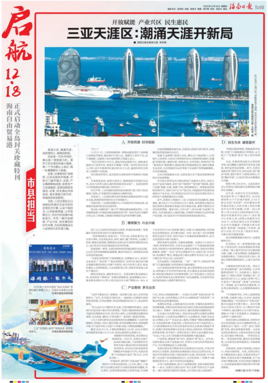 当前,三亚天涯区正以海南自贸港封关运作的历史契机为引擎,以实干践担当、以创新破局隘、以开放聚合力,在时代的浪潮中砥砺前行,书写一幅开放赋能、产业兴区、民生惠民的时代华章,为自贸港建设注入澎湃持久的天涯力量。
