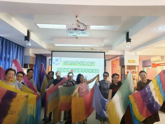 从设计图案、捆扎布料,到沉浸染缸、氧化固色,老同志们亲身体验了每一个充满未知与惊喜的步骤。当一条条独一无二的围巾在手中展开,深浅不一的蓝、随机而生的晕染花纹,宛如一幅幅写意水墨,让人惊叹于自然与匠心碰撞出的美。大家兴奋地展示着自己的作品,合影留念,将这份来自草木的温情与创作的喜悦永久珍藏。