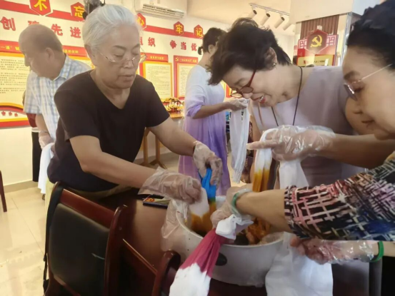 12月25日下午,金鸡岭路社区内弥漫着淡淡的草木清香,“非遗植物扎染围巾体验活动”带领老同志们走进了自然染色的奇妙世界。导师介绍了植物染的环保理念与文化价值,展示了板蓝根等天然染料如何幻化出迷人的蓝。